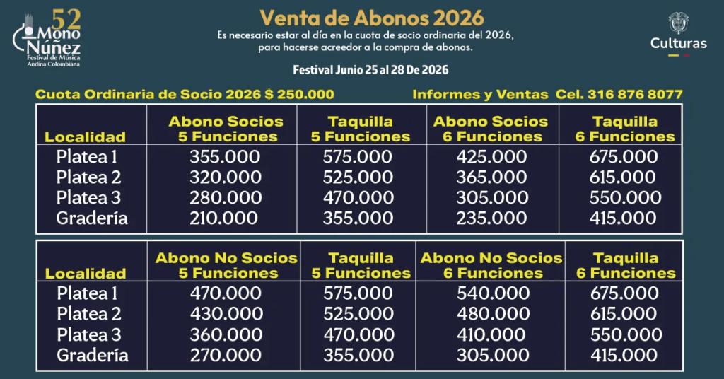 La organización del Festival Mono Núñez habilitó la venta de abonos para su edición 2026, con tarifas diferenciadas por localidad y tipo de público. Los precios varían entre socios y no socios, e incluyen opciones para cinco y seis funciones